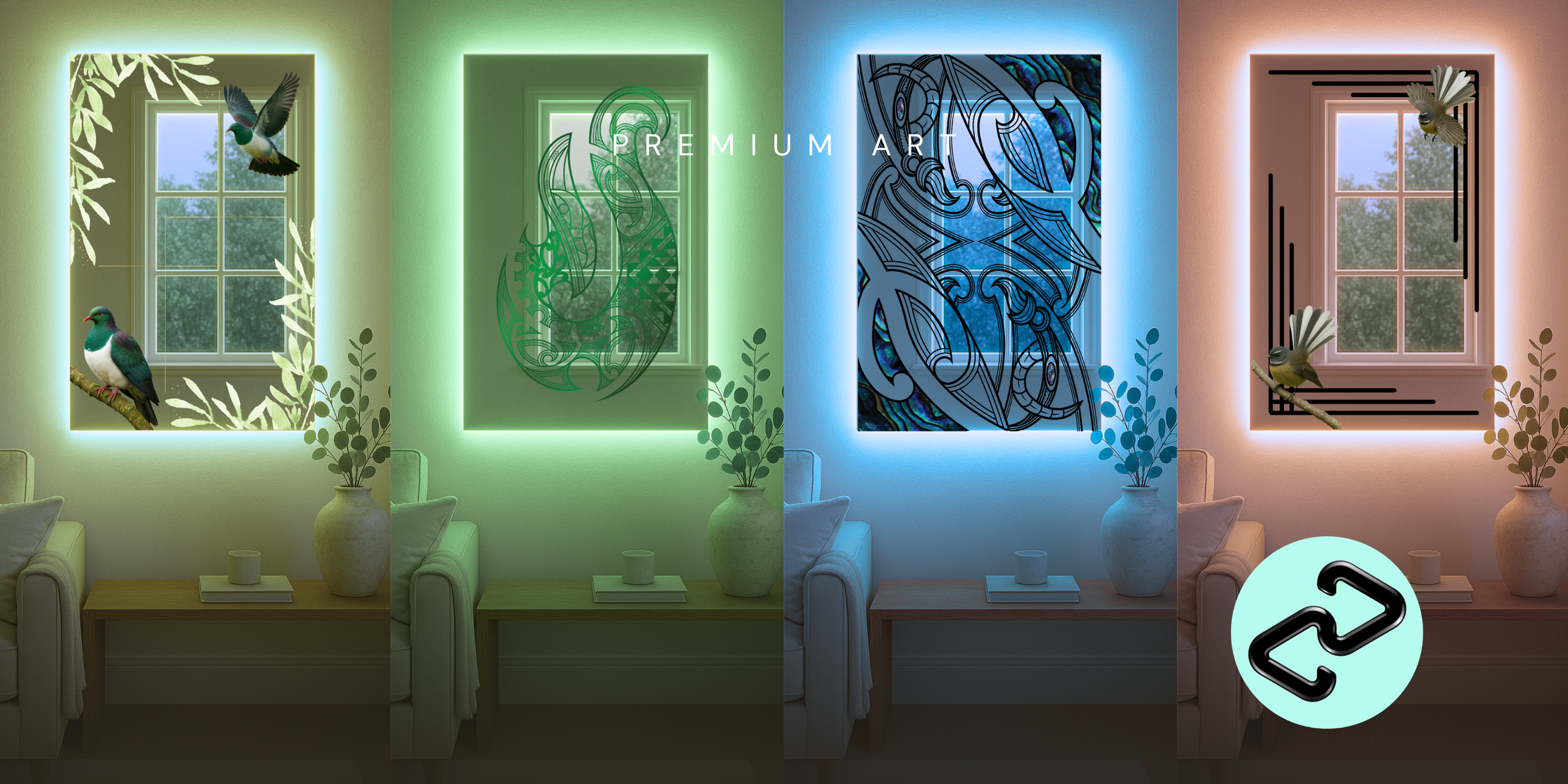 Each mirror is UV printed in stunning HD clarity, layered with intricate detailing and vivid turquoise-green hues that shimmer through light. The etched Poutama border adds a clean, geometric contrast that makes this design feel both ancient and futuristic.